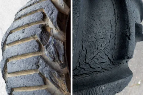 Another clear sign is sidewall damage. These cracks start small, usually from long hours under load or sunlight exposure. Over time they grow deeper. A small surface crack is normal aging, but long cracks that run across the sidewall signal that the casing is weakening. Once the casing loses strength, the tire can fail suddenly.